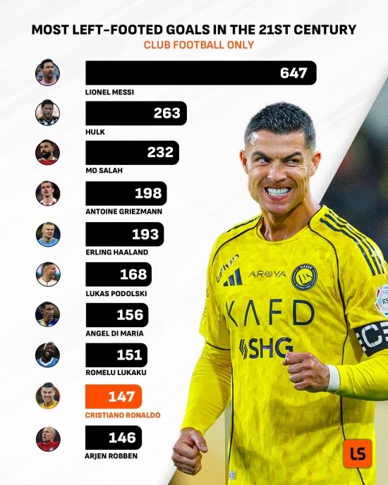 이 부문에서 가장 많은 득점을 차지한 건 왼발잡이 리오넬 메시(인터 마이애미)다. 그는 무려 647골을 왼발로 터뜨리며 엄청난 파괴력을 자랑하고 있다.