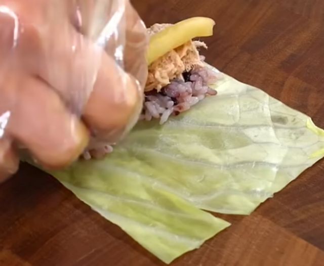 다음으로 섞은 참치와 청양고추에 마요네즈 2숟갈, 익힌 양배추에 소량의 밥과 참치를 올린 후 쌈장을 기호에 따라 올려준다. 여기서 원하는 재료가 있다면 더 넣어도 좋다. 씻은 김치를 넣어서 자칫하면 느끼할 수 있는 참치의 맛을 중화시켜 주는 것이 좋다.