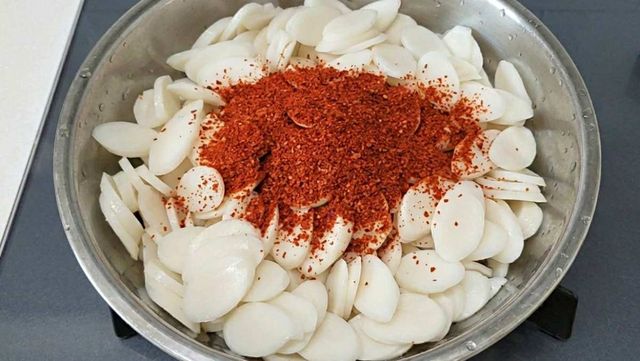 조리는 떡부터 시작한다. 떡국떡은 물에 가볍게 씻은 뒤 물기를 털어낸다. 여기에 고춧가루 2큰술을 먼저 뿌려 살살 버무린다. 이 과정에서 떡 표면에 고운 붉은색이 입혀진다. 나중에 국물에 넣었을 때 고춧가루가 따로 풀리지 않고 떡에 붙어 있어 맛이 겉돌지 않는다. 비주얼도 이 단계에서 이미 완성된다.