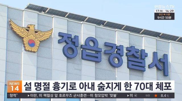 전북 정읍 경찰서. 설날 오전 자택에서 70대 남성이 아내를 흉기로 찔러 숨지게 한 사건이 발생해 경찰이 수사에 나섰다. 경찰은 A씨를 상대로 정확한 범행 경위와 동기 등을 조사하고 있다. / 연합뉴스TV 보도화면 캡처
