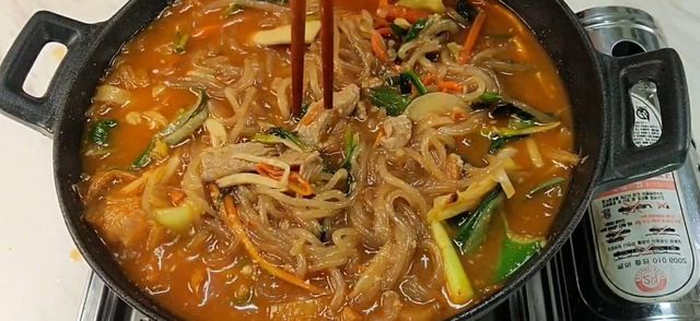 국물이 끓기 시작하면 양파와 고추장, 국간장을 넣어 간을 맞춘다. 이 단계까지는 잡채를 넣지 않는 것이 중요하다. 잡채를 처음부터 넣고 오래 끓이면 당면이 급격히 불어 식감이 무너진다. 국물 맛을 먼저 완성해 두는 것이 잡채탕 조리의 핵심이다.