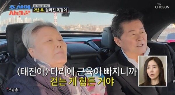 지난 16일 방송된 TV조선 예능 조선의 사랑꾼에서는 2년 만에 다시 출연한 태진아와 아내 옥경이의 안타까운 근황이 공개됐다. 이날 방송에서 태진아는 휠체어에 의지한 채 이동하는 아내를 세심하게 챙기며 병원을 찾았다. 그는 아내의 기운을 북돋우기 위해 병원 가서 다 나았다고 하고 오자며 끊임없이 다정한 말을 건넸다.