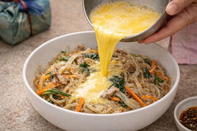 남은 잡채에 계란물을 붓는 모습. 기사 이해를 돕기 위해 AI를 활용해 제작한 자료 사진입니다.