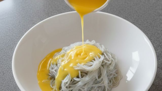 불린 당면에 계란물을 붓는 모습. AI가 생성한 자료사진.
