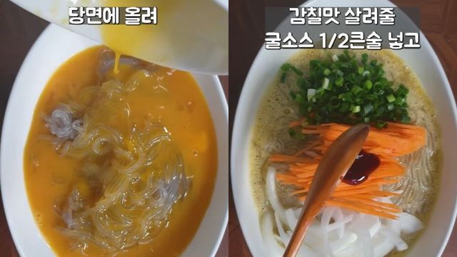 계란물을 부은 뒤에는 당면에 계란이 골고루 묻도록 충분히 섞어준다. 이후 준비한 양파, 당근, 쪽파를 넣고 한 번 더 섞는다. 여기에 감칠맛을 더하기 위해 굴소스 2분의 1큰술을 넣어 전체 재료가 고르게 어우러지도록 한다.