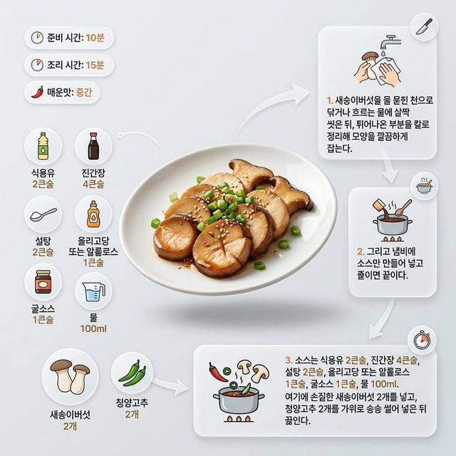 이 레시피는 유튜브 채널 ‘식탁일기 table diary’가 “버섯 싫어하는 사람? (무조건 이렇게 드세요, 고기보다 맛있게! 쉽고 맛있는 방법이예요”라는 영상에서 소개했다. 만드는 과정은 의외로 단순하다. 새송이버섯을 물 묻힌 천으로 닦거나 흐르는 물에 살짝 씻은 뒤, 튀어나온 부분을 칼로 정리해 모양을 깔끔하게 잡는다. 그리고 냄비에 소스만 만들어 넣고 졸이면 끝이다.