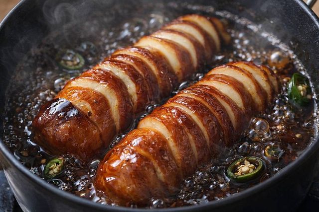 썸네일만 보고 “족발?”이라고 착각했다면 정상이다. 냄비에서 바글바글 끓는 간장소스 속, 칼집 낸 ‘이것’이 윤기를 뒤집어쓰고 탱글하게 익어간다.
