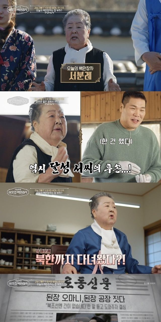 한편 이번 방송에서는 서분례를 둘러싼 또 하나의 놀라운 사건, 바로 북한 진출에 얽힌 숨은 사연도 공개된다. 멀리서도 비법을 배우러 찾아올 정도로 ‘장 박사’라 불리며 명성을 떨치던 서분례는 2006년, “북한에 된장 공장을 지어달라”는 뜻밖의 요청을 받고 직접 북한 땅을 밟게 됐다. 서분례는 “북한 관계자와 처음 마주 앉았을 때 너무 긴장해 무슨 말을 해야 할지 몰랐다”고 당시를 떠올린다. 하지만 이어진 북한 관계자의 한마디는 그녀의 마음을 움직였고, 결국 서분례는 그들을 돕겠다는 결심을 하게 됐다. 이후 그녀는 북한의 된장 공장 건립을 성공적으로 이끌었고, 그 공로로 북한 신문에 ‘된장 오마니’라는 이름으로 대서특필되며 또 하나의 전설을 남겼다.