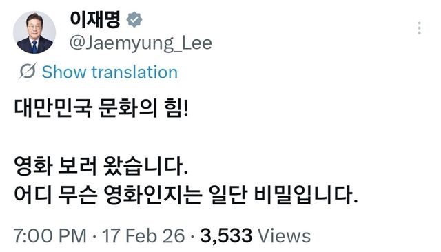 17일 이재명 대통령이 엑스에 올린 글. 이 대통령은 이날 관람 직전 엑스(옛 트위터)에 올린 글에서 "대한민국 문화의 힘! 영화 보러 왔습니다"라고 밝혔다. 그러면서 "어디에서 무슨 영화를 보는지는 일단 비밀"이라고 덧붙였다.