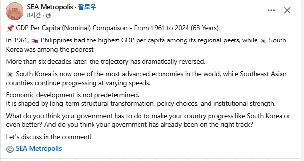 1961년, 필리핀은 동남아시아 국가들 중 가장 높은 1인당 GDP를 기록했던 반면, 한국은 최빈국 중 하나였습니다.