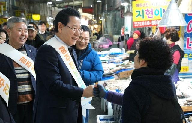 | ▲ 김영록 전라남도지사가 설 명절을 앞둔 15일 지역 전통시장인 광주 양동시장을 방문해 전남·광주 행정통합의 취지와 추진 방향을 설명하고 물품을 구매하며 상인들을 격려하고 있다. |