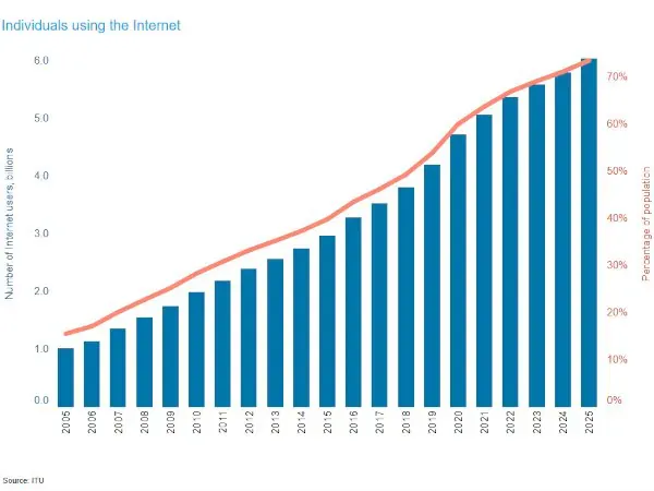 전 세계인의 4명 중 3명은 인터넷에 연결돼있고 SNS 이용자는 56억, AI 서비스 이용자는 10억으로 추산됨