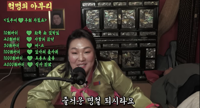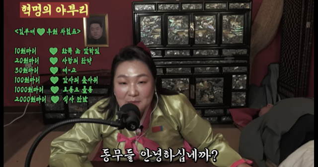영상에서 이수지는 북한 BJ 김부애로 변신했다. 그의 뒤에는 자개장롱과 김정은 북한 국무위원장처럼 분장한 김규원의 사진이 걸려 있어 눈길을 끌었다.