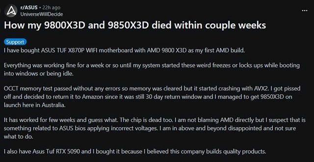 AMD의 최신 게이밍 CPU인 라이젠 7 9850X3D 출시 후 3주도 채 지나지 않아, 9800X3D와 9850X3D를 연속으로 교체했음에도 동일 증상을 겪었다는 사례가 레딧에 올라왔다. 완전 사망(Death) 사례라기보다는 반복적인 불안정(Failure) 사례다. 그러나 9850X3D 관련 첫 보고라는 점에서 주목된다. 사용자는 ASUS TUF X870P WiFi 보드의 BIOS 전압 설정이 과도했을 가능성을 제기하며, MSI 메인보드를 새로 주문한 상태라고 전했다