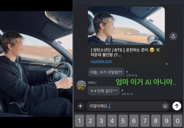 RM은 자신의 운전 실력을 믿지 못하는 모친의 반응도 실시간으로 공개했다. RM의 모친은 유튜브에 올라온 아들의 운전 영상을 공유하며 “이거 리얼임? 진짜 같다”고 했고, RM은 “엄마 이거 AI 아니다. 리얼”이라고 해명해 웃음을 안겼다.