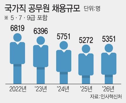 인사혁신처에 따르면 올해 국가직 공무원 채용규모(5·7·9급 포함)는 5351명으로 △2022년 6819명 △2023년 6396명 △2024년 5751명 △2025년 5272명 등 지속 감소하다 고용노동직의 대규모 증원으로 5년 만에 증가세로 전환했다.