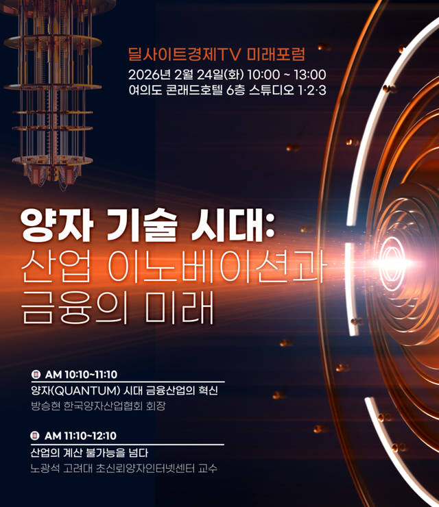 딜사이트경제TV는 오는 24일 오전 10시 서울 여의도 콘래드호텔(6층 스튜디오 1‧2‧3)에서 ‘양자기술 시대:산업 이노베이션과 금융의 미래’를 주제로 미래포럼을 개최한다.