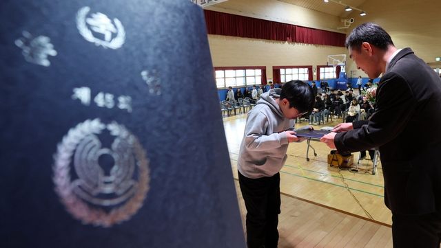 대전의 한 초등학교에서 열린 졸업식에서 졸업생이 졸업장을 받고 있다. 기사의 이해를 돕기 위한 사진 / 뉴스1