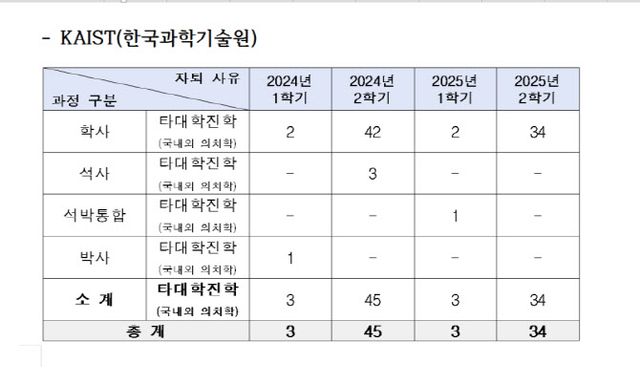 학교별로 보면 KAIST(한국과학기술원)는 2024학년도 의·치대 진학 사유 자퇴자가 48명이었고, 이 가운데 석·박사 과정 학생도 4명 포함됐다. 반면 2025학년도에는 관련 자퇴자가 37명으로 감소했으며, 석사 이상은 1명에 그쳤다.