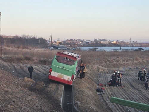 19일 경찰 등에 따르면 이날 오전 7시께 익산시 여산면 한 도로에서 사내 통근버스가 가드레일을 받고 농수로에 빠졌다.