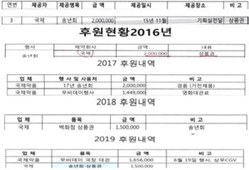 2017년과 2019년 병원 직원 단체 관람 행사인 ‘무비데이’를 위해 각각 144만 9,000원, 165만 6,000원의 대관료를 대신 결제했다.