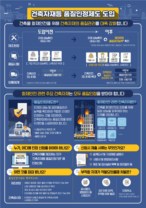 건축자재 품질인정제도는 화재 안전성이 중요한 건축자재에 대해 명확한 성능기준을 제시하고 기준에 맞게 제조·시공하도록 관리하는 제도다.