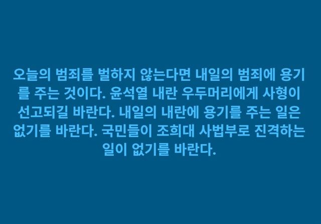 이어 "내일의 내란에 용기를 주는 일은 없기를 바란다"라며 "국민들이 조희대 사법부로 진격하는 일이 없기를 바란다"라고 덧붙였다.
