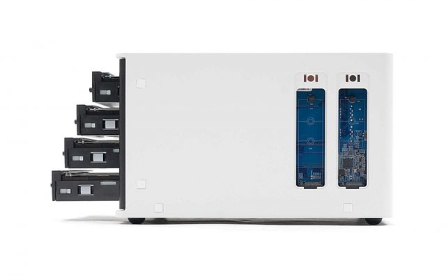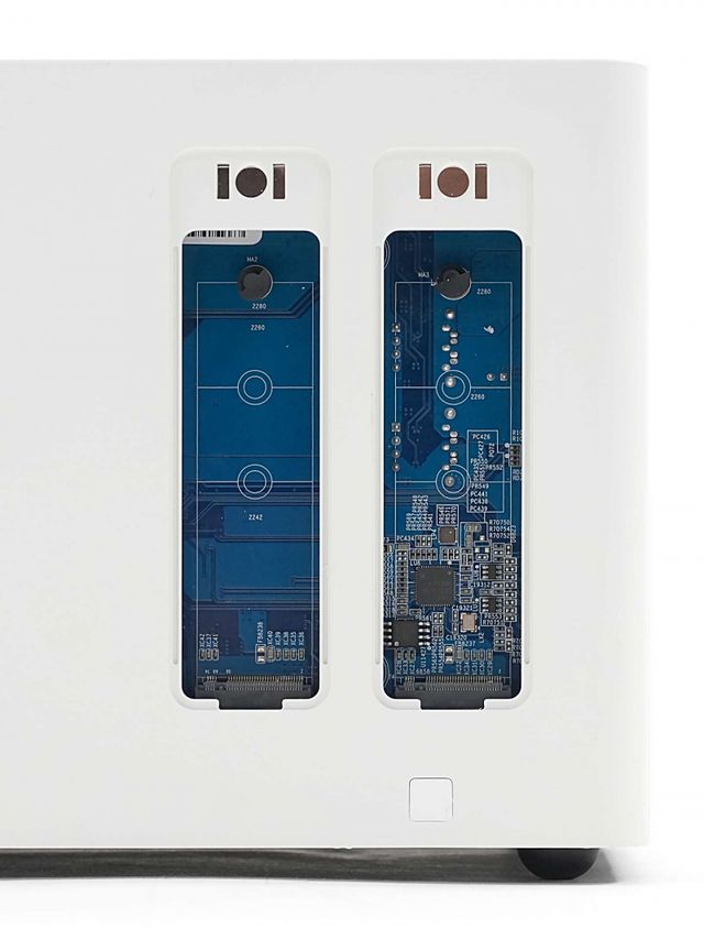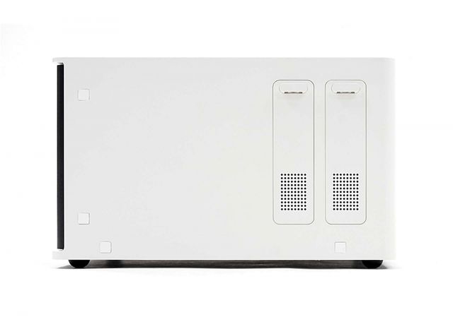측면 설계는 NAS400Plus의 특장점과 연결된다. 특이하게도 측면에도 커버 구조가 있고, 마찬가지로 마그네틱 방식으로 여닫을 수 있다. 여기에는 2280 규격의 M.2 스토리지를 최대 2개까지 설치할 수 있다. 즉, 본체 외형 디자인의 일체감을 유지하면서 필요한 장비를 확장할 수 있게 했다. 타사 NAS 장비는 확장이나 점검을 하려면 커버를 통째로 해체하거나 나사를 풀어야 하는 경우가 적지 않다. 과정이 번거로우면 현실적으로는 작업이 뒤로 밀리기 쉽다. NAS400Plus의 측면 커버는 제법 편리하다. 특히 NVMe 기반의 캐시처럼 있으면 요긴한 확장 요소를 운용하기에 유리한데다, 4베이 NAS 정도 되면 ‘처음부터 풀 세팅하는 장비’가 아닌 이상 EFM의 접근성은 분명한 장점이다.