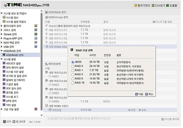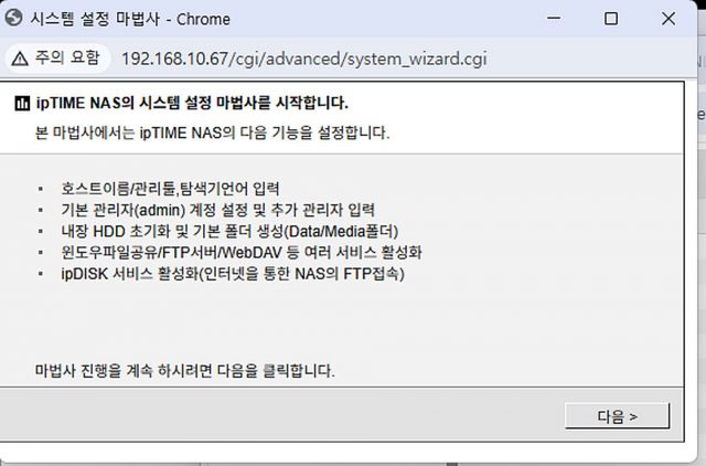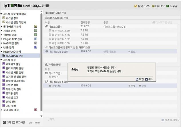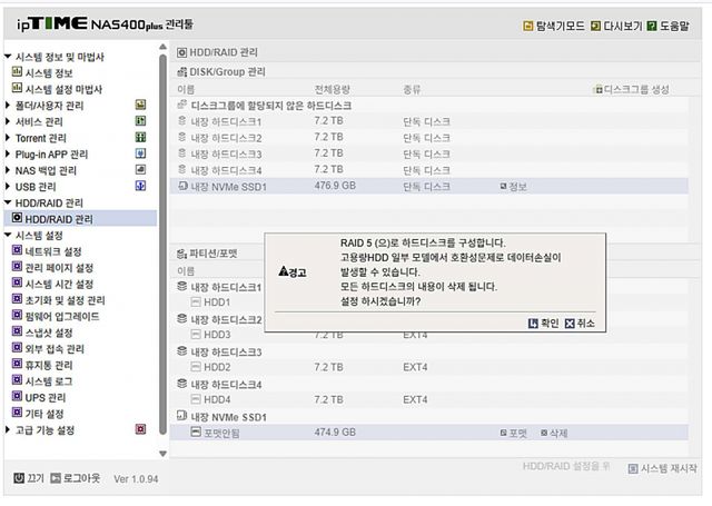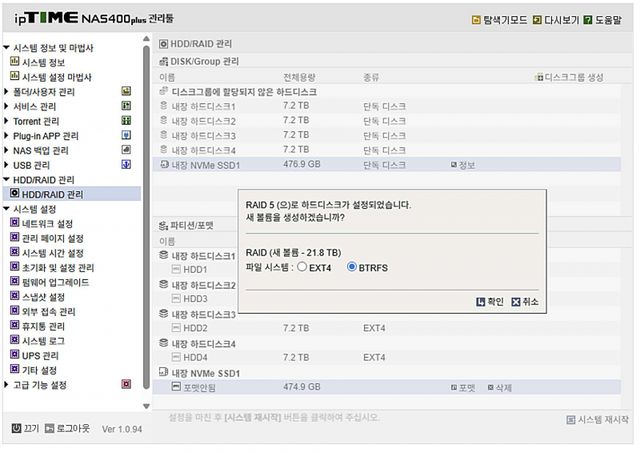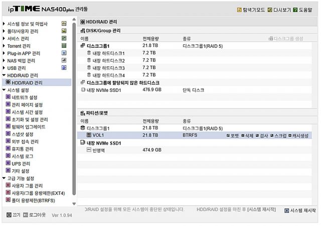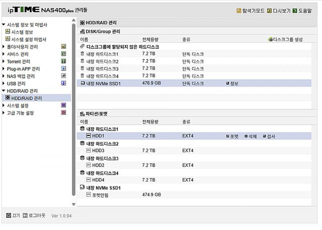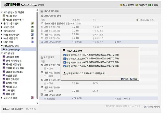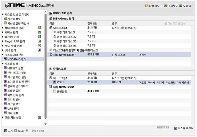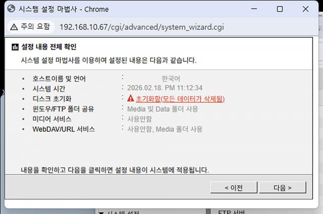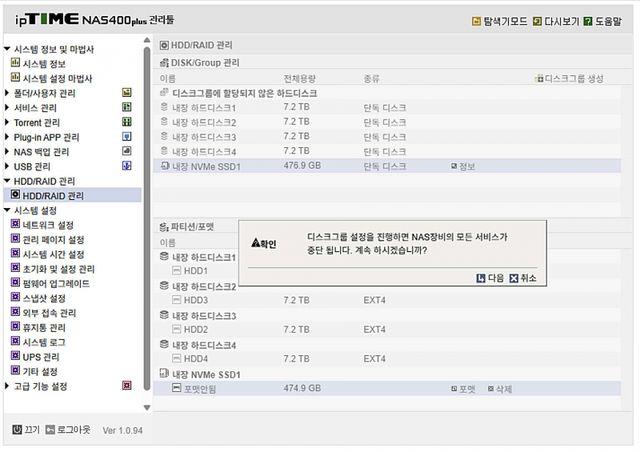 아이피타임 NAS400Plus를 평가할 때 핵심은 '무엇을 얼마나 쉽게 할 수 있는가'다. NAS는 HDD를 장착하고, 볼륨을 만들고, 공유 폴더를 나누고, 백업 경로를 정하고, 외부 계정을 생성하고 관리하는 일련의 과정이 이뤄져야 한다. NAS400Plus는 복잡할 것만 같은 과정을 ‘전문가의 영역’으로 만들지 않으려는 노력을 기울였다. 4베이 NAS를 처음 쓰는 사용자에게도, 이미 NAS를 써본 사용자에게도 설치·세팅 방식이 익숙한 UI로 진행된다. 바로 아이피타임 장비에서 공통적으로 적용한 UI다.**