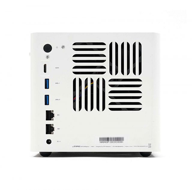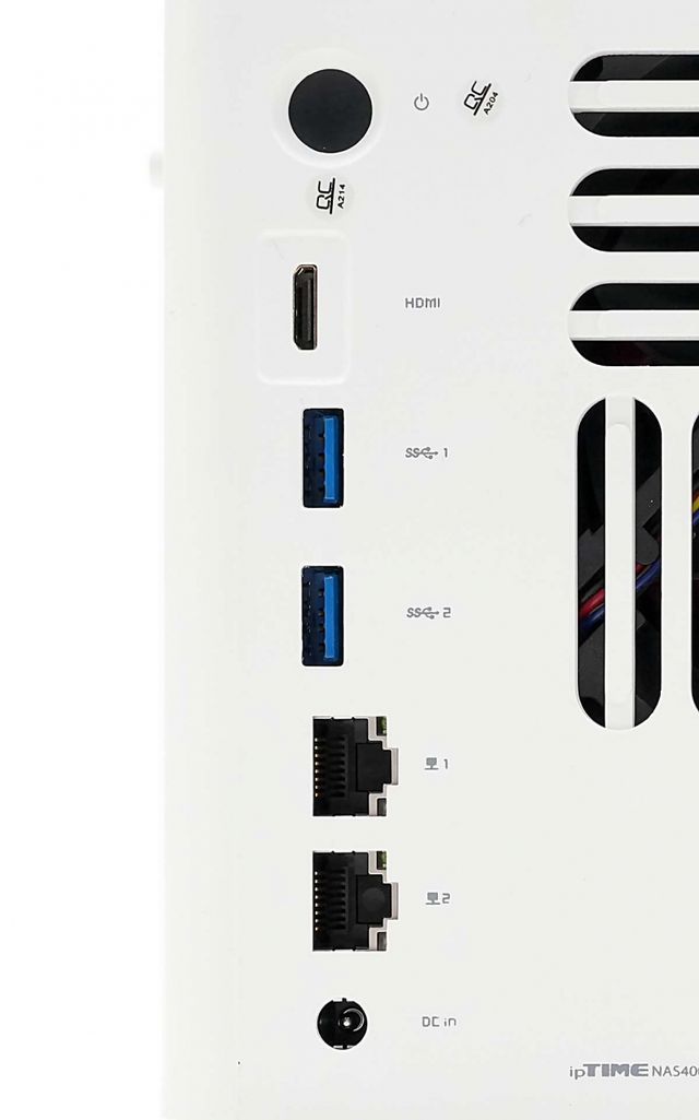 후면을 보면 전원 버튼을 시작으로 마이크로 HDMI, USB 3.0 포트 2개, 2.5GbE LAN 포트 2개, DC-in이 한 라인으로 정렬되어 케이블 라우팅이 복잡해지지 않는다. NAS는 24시간 365일 운용되는 장비이기 때문에 발열 관리도 중요하다. NAS400Plus는 후면 우측에 팬이 있는데, 해당 위치에 통풍구가 원형으로 존재한다. 물론 측면 NVMe 슬롯에도 펀칭 형태의 통풍 홀이 있어 이곳에서도 외부 공기가 유입된다. 참고로 4베이는 HDD가 4개나 장착되는 만큼 발열도 그만큼 많다. 통풍구 면적과 배기 통로의 확보는 안정성을 위한 전제에 가깝다.