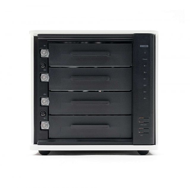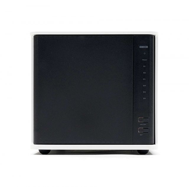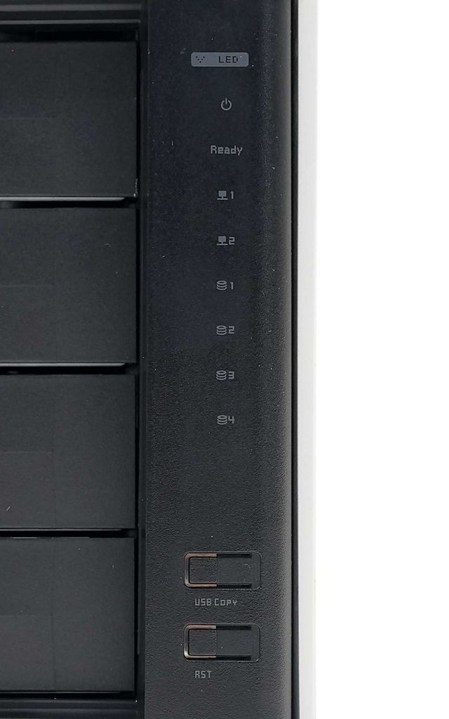 전면 우측의 상태 표시부는 정보의 우선순위를 감안해 배치했다. 상단에는 LED 표시를 제어하는 항목이 배치되어 있고, 그 아래로 Ready, 그리고 디스크 베이 1~4의 상태 표시가 일렬로 이어진다. NAS는 웹 UI에서도 상태를 확인할 수 있지만, 실사용에서 LED는 여전히 가장 빠른 1차 진단 포인트다. 특히 다수의 디스크를 운용하는 NAS라면 '문제의 HDD가 어디인지'가 대응 속도를 좌우한다. Ready로 장비의 기본 동작 상태를 확인하고, 1~4번 표시로 문제 위치를 바로 분기할 수 있게 한 디자인은 현장 운용에 유리한 요소다. 전면 하단에는 USB Copy 버튼과 Reset 버튼이 따로 마련돼 있다.