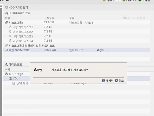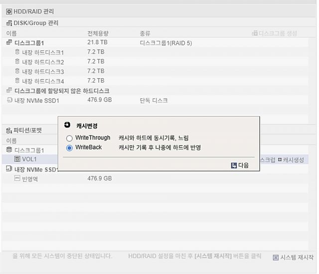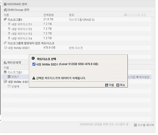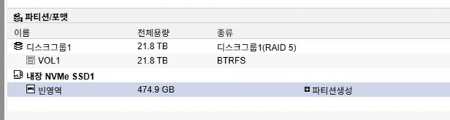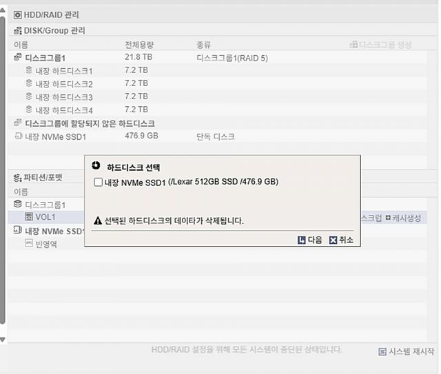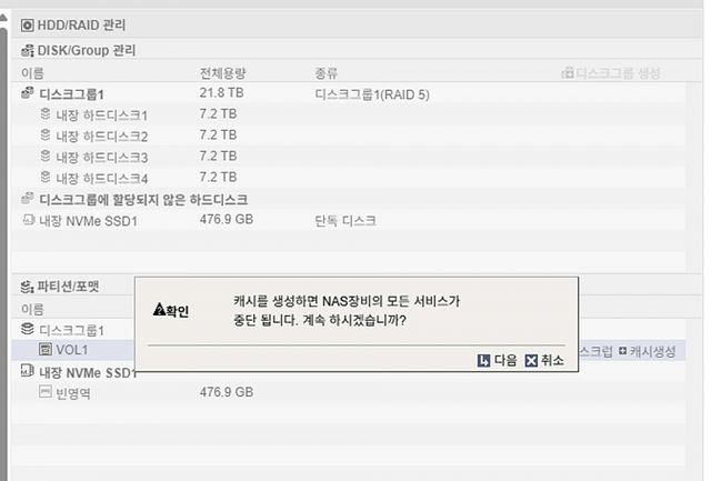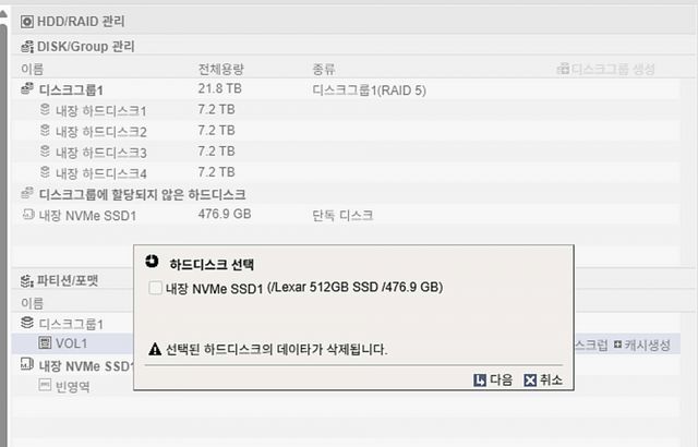 NVMe SSD1이 빈영역(474.9GB)으로 목록에는 뜨는데 '캐시 생성'에 체크가 안 될 경우는 사용했던 구형 SSD를 설치했을 경우 발생하는 증상이다. 이는 NVMe 안에 예전 파티션/RAID/LVM 메타데이터를 완벽하게 삭제해야 세팅할 수 있다. NAS 에 설치한 상태로는 안되며, PC에 설치 후 작업해야 한다. 참고로 윈도우 컴퓨터 관리의 '디스크 초기화(파티션 테이블 삭제)'로 안될 수 있다. 따라서, 아래 방식으로 NVMe를 ‘완전 초기화(clean)’ 할 것을 권장한다.