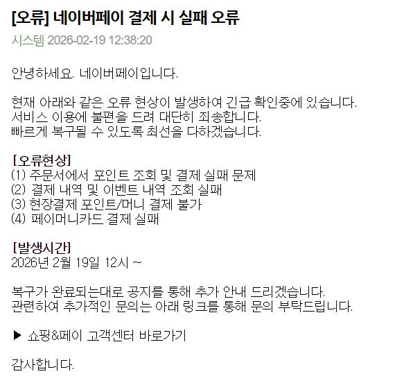 19일 네이버페이에 따르면 이날 오전 12시부터 △주문서에서 포인트 조회 및 결제 실패 문제 △결제 내역 및 이벤트 내역 조회 실패 △현장결제 포인트·머니 결제 불가 △페이머니카드 결제 실패 오류현상이 발생했다.