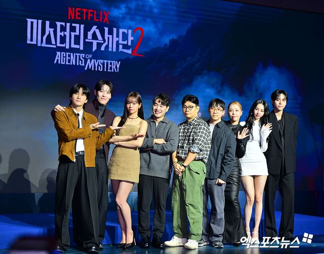 19일 오전 서울 마포구 호텔 나루 서울 엠갤러리 나루 볼룸에서 넷플릭스 예능 '미스터리 수사단 시즌2' 제작발표회가 진행됐다. 이날 이용진, 존박, 혜리, 김도훈, 카리나, 가비와 정종연 PD, 김서구 PD, 이원기 PD가 참석했다.