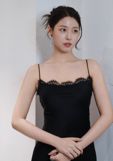 공개된 사진 속 설현은 레이스가 달린 블랙 슬립 드레스를 입고 직각 어깨라인을 드러냈다. 머리를 묶어 올린 스타일과 드롭 귀걸이로 목선을 강조하며 고혹적인 분위기를 연출했다.