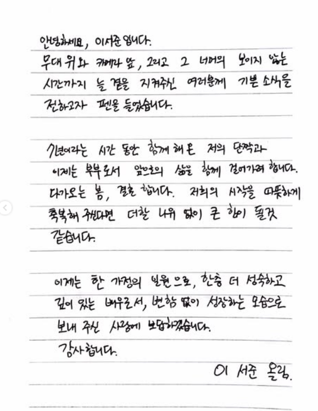 이서준은 최근 자신의 SNS를 통해 웨딩 화보와 자필 편지를 게시하며 결혼 소식을 직접 알렸다.