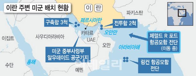 18일(현지시간) 월스트리트저널(WSJ), 악시오스 등은 미 당국자를 인용해 미국이 전날 하루 동안에만 중동 지역에 F-35·F-22·F-16 등 전투기 50대를 추가로 이동, 수 백대를 집결시켰다고 보도했다. 또 첫 번째 항공모함 에이브러햄 링컨함이 이미 이 지역에 배치된 가운데, 공격기와 전자전기를 탑재한 세계 최대 항모 제럴드 R. 포드함도 이동 중이다.
