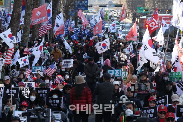 법원 앞 서초구 서초대로 일대는 혼란에 빠졌다. 윤 전 대통령의 공소기각 혹은 무죄를 주장하며 집회에 참석한 신자유연대와 부정선거 방지대 등 강성 보수단체 1000여 명은 무기징역을 선고되자 일제히 “정치 재판”이라며 고성을 지르고 욕설을 내뱉었다. 일부 지지자는 선고 결과를 믿을 수 없다는 듯 울먹거리며 바닥에 주저앉기도 했다.