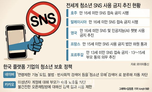 한국은 현재까지 구체적인 규제 논의가 이뤄지지 않고 있다. SNS 우회 접속을 기술적으로 막기 어려운 데다 지난 2011년 도입한 ‘게임 셧다운제’가 10년 만에 폐지된 전례 등도 규제 도입 논의를 가로막고 있는 장애물이다. 미국에서 쿠팡 사태를 두고 한국 정부에 압박을 가하듯 미국 빅테크에 침식당한 한국 시장 상황에서 규제 강화로 흐른다면 한미 통상 문제로 확산할 수 있어 조심스러울 수밖에 없다. 방송미디어통신위원회는 “해외에서 (SNS 금지) 관련 입법 확산 등에 대해 면밀히 살펴보고 있다”며 “아동과 청소년의 의견을 정책 검토와 제도 개선 과정에 반영할 수 있도록 검토하고 있다”고 언급했다.