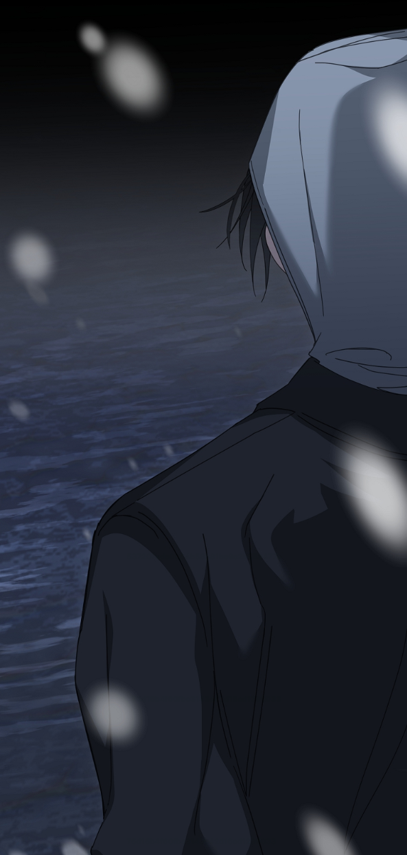 차가운 강바람이 부는 다리 위, 유하는 서 있습니다.