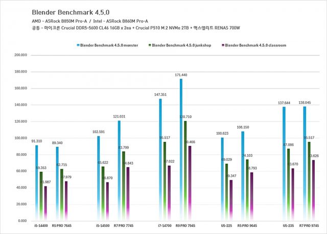 Blender Benchmark 4.5.0(점수 높을수록 유리) 기준으로, 좌→우 5개 구간에서 AMD의 평균 우위(3개 씬 평균)는 각각 +5.9% / +28.0% / +25.9% / +11.3% / +8.5%로 나타났다. 15개 항목 전체를 평균 내면 AMD가 약 +15.9% 우위다. Blender Benchmark는 Cycles 기반으로 monster·junkshop·classroom 씬을 CPU로 렌더링해 멀티스레드 처리량, 부동소수점·벡터 연산, 캐시/메모리 효율을 본다. 조달 환경에선 3D 렌더링·시각화·VFX·배치 렌더(대량 작업/동시 작업)에서 AMD 쪽이 처리시간 단축 효과가 기대된다.