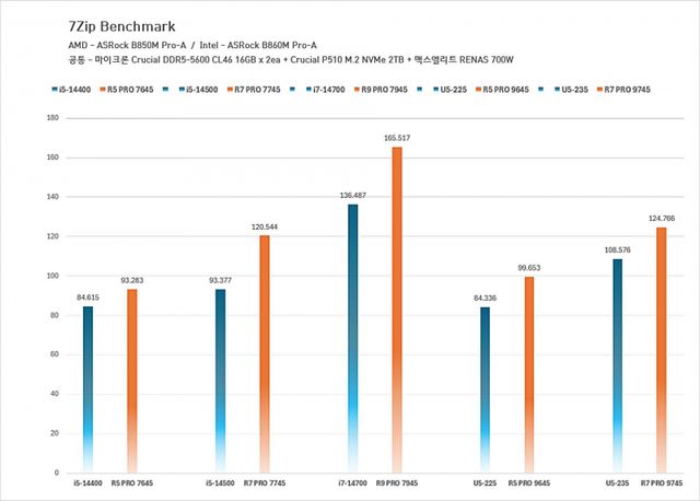 7-Zip Benchmark(값이 높을수록 유리)에서 좌→우 5개 구간 AMD 우위는 각각 +10.2% / +29.1% / +21.3% / +18.2% / +14.9%로 나타났다. 평균으로 환산하면 AMD가 약 +18.7% 우위다. 7-Zip 벤치는 압축/해제 처리량을 통해 정수 연산, 멀티스레드 스케일링, 캐시·메모리 대역 효율을 주로 본다. 조달 환경에선 백업/아카이빙, 대용량 로그·문서 압축, 배포 패키징, 데이터 이동·보관 작업에서 AMD 쪽이 체감상 유리한 구간이 생기기 쉽다.