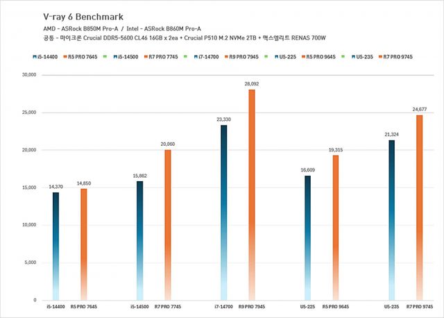 V-Ray 6 Benchmark(점수 높을수록 유리)에서 좌→우 5개 구간 AMD 우위는 각각 +3.3% / +26.5% / +20.4% / +16.3% / +15.7%로 나타났다. 평균으로 환산하면 AMD가 약 +16.4% 우위다. V-Ray CPU 벤치는 레이트레이싱 기반 렌더링을 통해 멀티코어 처리량, 부동소수점·벡터 연산, 캐시/메모리 효율을 강하게 본다. 조달 환경에선 3D 설계 시각화, 건축·제품 렌더, 콘텐츠 제작, 배치 렌더/동시 작업에서 AMD 시스템 사용시 처리시간 단축 효과가 극명하게 드러난다.