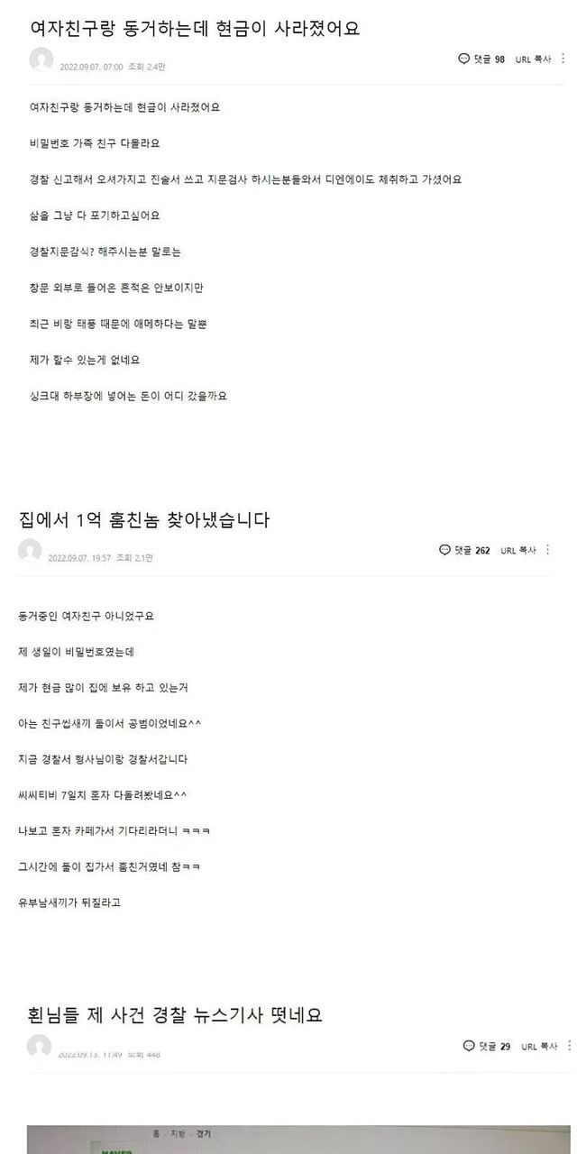 가장 가까운 사람을 믿지 못하게 되는 순간만큼 고통스러운 일은 없습니다. 최근 온라인 커뮤니티에는 동거 중인 여자친구와의 신뢰 관계를 송두리째 흔들어놓았던 '현금 1억 원 도난 사건'의 전말이 공개되어 누리꾼들에게 큰 충격을 안겨주었습니다.