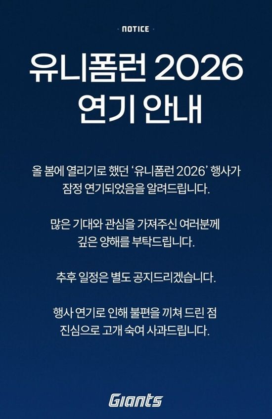 롯데는 19일 구단 공식 SNS를 통해 "올봄 개최 예정이었던 유니폼런 2026 행사를 잠정 연기한다"고 발표했다. 이는 사직종합운동장 일대 5km 코스를 달리는 팬 참여 행사로 시범경기 티켓과 사인 유니폼 등 다양한 혜택이 준비됐지만 결국 연기됐다. 구단은 "불편을 끼쳐드려 진심으로 사과드린다"고 고개를 숙였다. 2026시즌 팬 출정식 성격을 띠던 행사마저 차질을 빚으면서 팀 이미지 타격은 불가피해졌다.