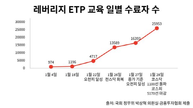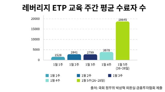 19일 이데일리가 박상혁 더불어민주당 의원실을 통해 금융투자협회로부터 확보한 ‘국내외 레버리지 ETP Guide’ 수료 현황에 따르면, 올해 1월 온라인 교육 수료자는 16만7281명으로 집계됐다. 이는 2020년 9월 의무교육 도입 이후 월간 기준 역대 최대치로, 직전 최고였던 2021년 1월(14만9772명)을 가뿐히 넘어섰다. 지난해 연간 수료자(20만5403명)의 81.4%에 해당하는 인원이 불과 한 달 만에 쏟아진 것이다.