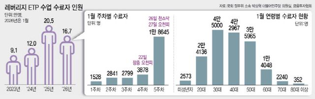 레버리지 ETF 시장이 빠르게 팽창하는 가운데, 전문가들은 위험 감내 여력이 낮은 청년층·소액 신규 투자자가 고배율 상품에 무방비로 노출될 경우 하락장에서 손실 충격이 걷잡을 수 없이 커질 수 있다고 경고한다. 이르면 올해 2분기부터 삼성전자(005930)·SK하이닉스(000660)·현대자동차(현대차(005380)) 등 국내 우량주를 기초로 한 단일종목 레버리지 ETF 상장이 허용될 전망인 가운데, 특정 초대형주에 수급이 집중될 경우 하락장에서 시장 변동성을 더욱 키울 수 있다는 우려도 제기된다.