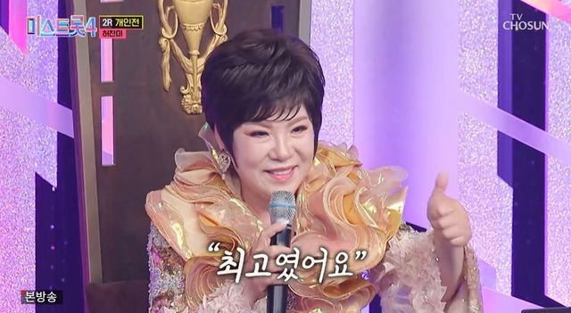 무대가 끝난 뒤 김연자는 울컥한 듯 말을 잇지 못하다가 “허찬미가 퍼포먼스를 굉장히 많이 하는데 제 노래가 퍼포먼스 할 게 많지 않다. 그래서 왜 내 노래로 하냐고 물어보니 사람들의 편견을 깨고 싶어서라고 하더라. 그 말을 들을 때 과연 말과 실천이 될까 싶었고, 좋은 자리에 왔는데 정통을 해서 내려올 필요는 없다고 생각해 걱정했지만 정말 최고였다”고 말했다.