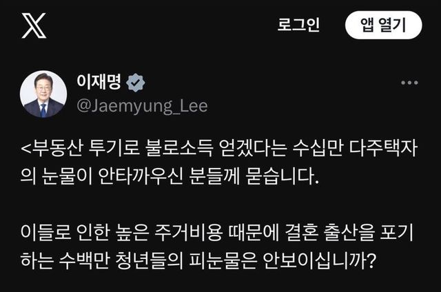 지난 3일에는 “상식적이고 번영하는 나라를 위해 망국적인 부동산 투기는 무슨 수를 써서라도 반드시 잡을 것” “높은 주거비용으로 결혼·출산을 포기하는 수백만 청년의 피눈물은 안 보이나” “돈이 마귀라더니, 설마 마귀에게 최소한의 양심마저 빼앗긴 것은 아닌가” 등으로 발언 수위를 높였다.