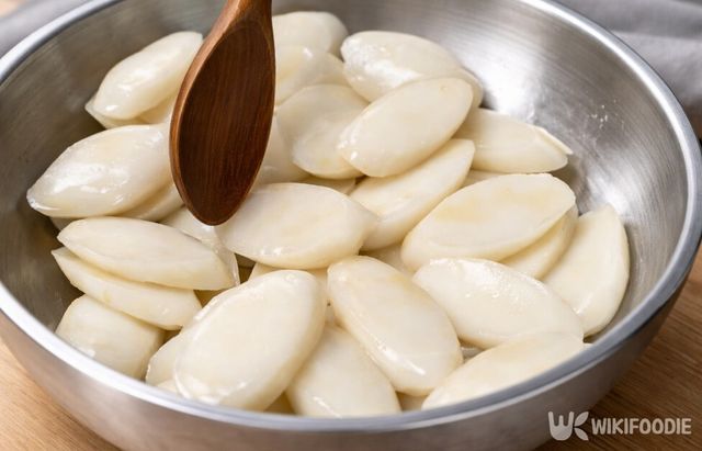 1. 떡국떡을 미지근한 물에 20분 담가 둔 뒤 물기를 뺀다.